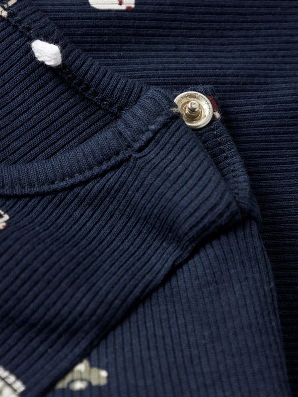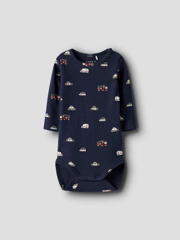 Ribbad, mjuk och skön body med tryckknappar i grenen och på ena axeln. Heltäckande tryck av utryckningsfordon.