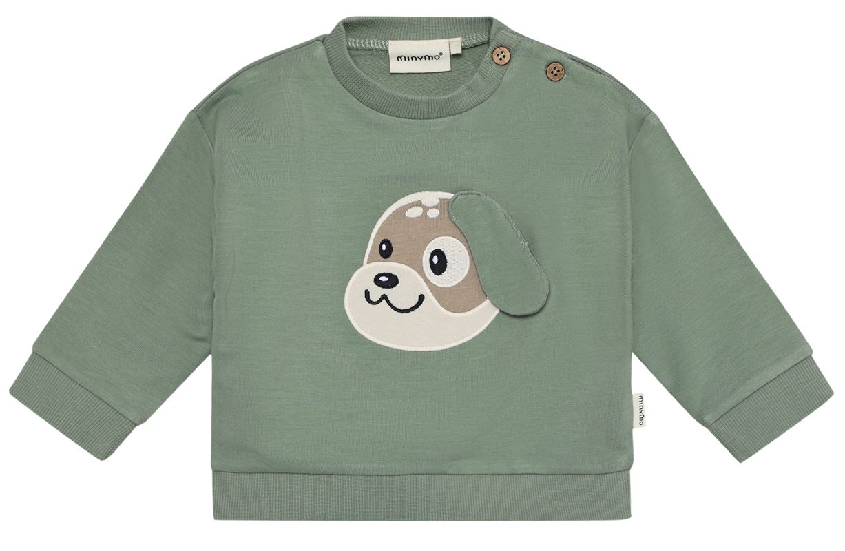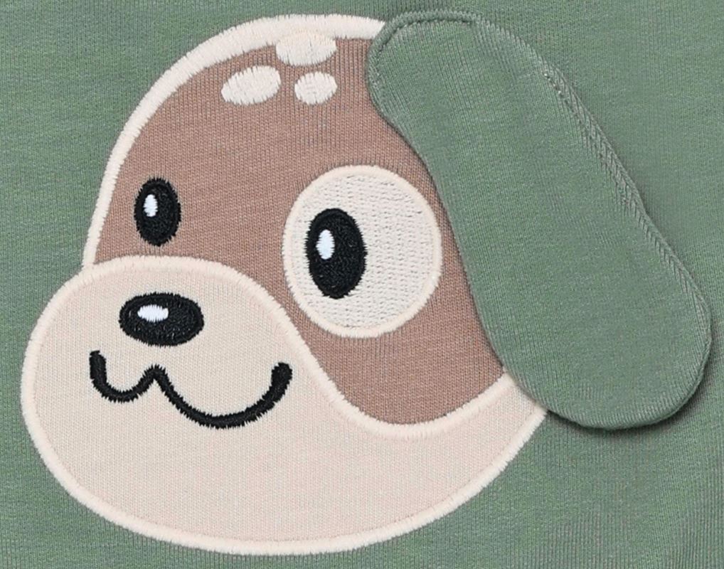 Mjuk tröja med hundansikte med ett hängande öra på magen.